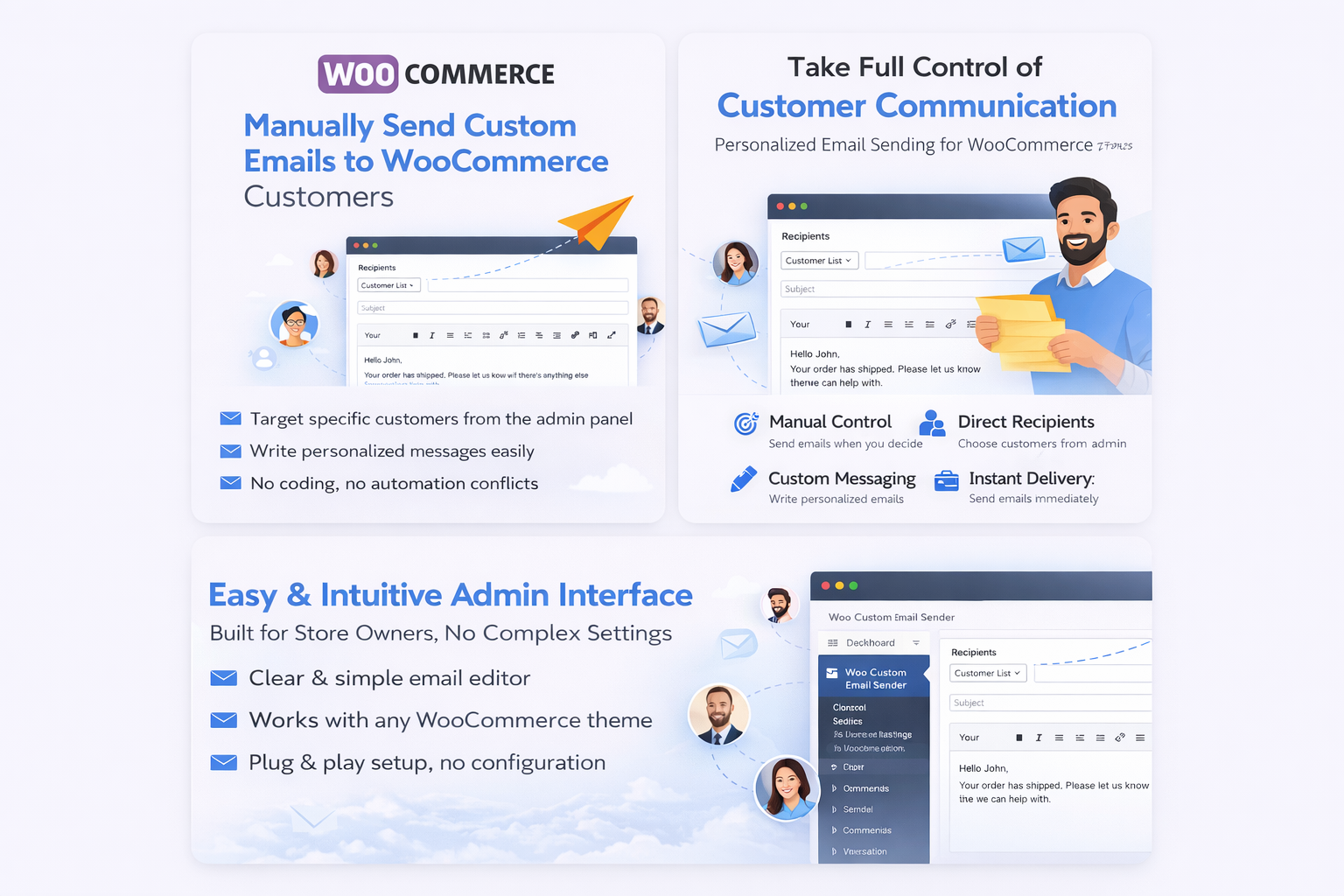 Woo Custom Email Sender solves this problem by giving you a simple, powerful way to manually send custom emails to your customers β directly from your WordPress admin panel.