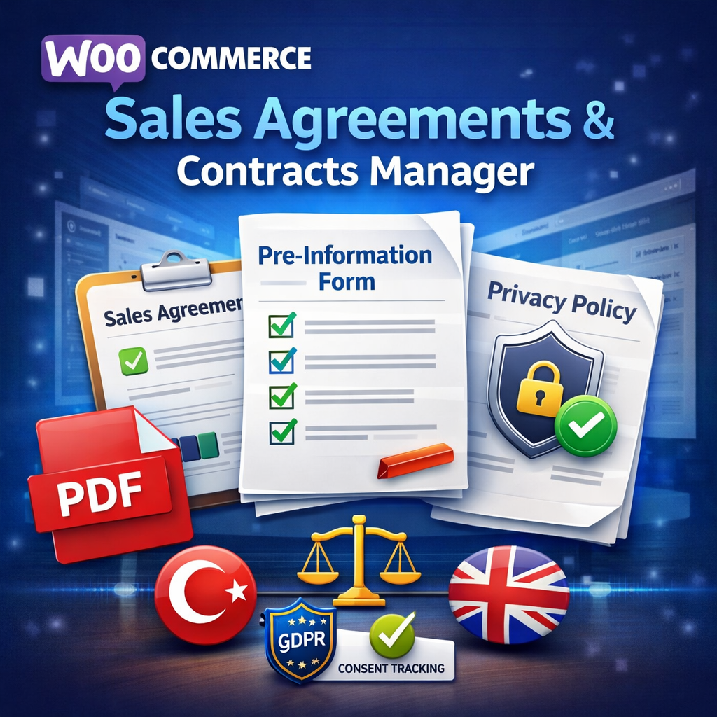 It automatically generates sales agreements, pre-information forms, privacy and refund policies for each order, securely records customer consent, and creates order-based PDF documents for legal compliance and record keeping.